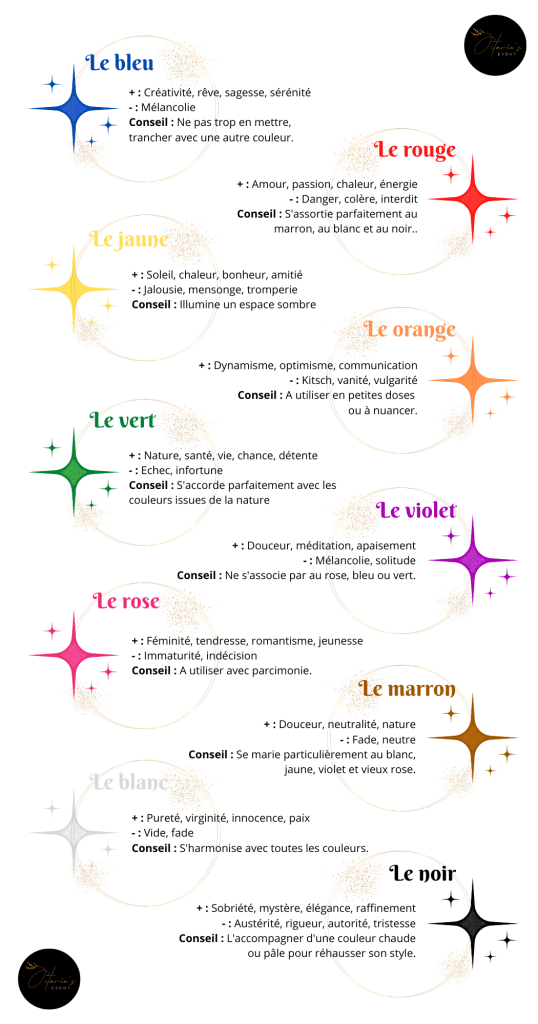 Vous n’avez pas de thème pour votre mariage, c’est ok ! Mais un choix de couleurs sera obligatoire pour donner le ton à votre mariage. Vous pouvez choisir vos couleurs préférées, ou encore des couleurs qui rappellent un univers en particulier, mais si vous êtes perdu dans votre choix, ou que vous souhaitez que les couleurs choisies expriment quelque chose en particulier, alors cet article est fait pour vous.